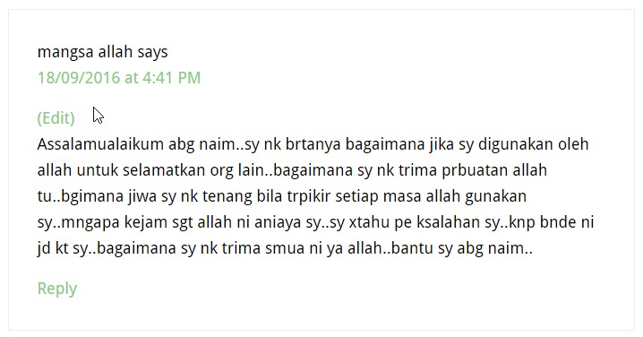 Kenapa Allah zalim dengan aku?”Kenapa Allah tidak memberi aku kehidupan yang aman, seperti orang lain?Mengapa ujian Allah berikan ini terlalu berat, sedangkan aku tidak pernah buat perkara jahat?Jika perpisahan membuatkan kita hilang arah, jadi apa tandanya Allah sayangkan kita? Bukankah ini Allah zalim? Bukankah ini lebih melemahkan?Ustaz selalu kata Allah janjikan kebahagiaan untuk hambanya yang berdoa. Selama ni aku tak pernah berhenti berdoa, tetapi mengapa Allah tetap menghukum aku dengan musibah yang benar-benar membuatkan aku terduduk?